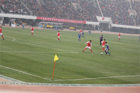 裕彤體育中心足球場長110米、寬68米,中國足協(xié)領(lǐng)導(dǎo)認(rèn)定其具有國際標(biāo)準(zhǔn),有能力承辦任何級(jí)別的足球比賽。其它如田徑場、草坪、進(jìn)口塑膠跑道,主席臺(tái)、觀禮臺(tái)的照明、音響系統(tǒng)、彩色記分屏,亦屬世界一流。場中更奪目的是那座大型圖文顯示屏,面積240平方米,具有設(shè)時(shí)、文字、圖像等多功能,其質(zhì)量、亮度、可視角和程序設(shè)置等都達(dá)到了國際一流水平。北面三架寬大的車輛棧橋與環(huán)建筑外圍棧橋等等融為一體,各種車輛可直通場內(nèi),12礅螺旋式步行梯及一座大型步行梯入口、24座看臺(tái)出口使人流疏散合理、快捷、安全。