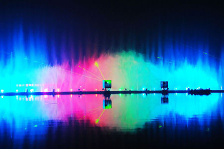 月亮灣音樂噴泉位于月牙湖廣場(chǎng)旁,長(zhǎng)約100米,寬20米,音樂噴泉表演是在一般音樂噴泉控制的基礎(chǔ)上加入了更新的專業(yè)噴泉控制系統(tǒng)及軟件,計(jì)算機(jī)通過對(duì)專業(yè)編程、音頻及MIDI信號(hào)的識(shí)別,進(jìn)行譯碼和編碼,更終將信號(hào)輸出到控制系統(tǒng),使噴泉的聲、光、電三者達(dá)到同步,從而使噴泉水型、燈光及色彩的變化與音樂情緒的結(jié)合,使噴泉表演更加生動(dòng)更加富有內(nèi)涵。