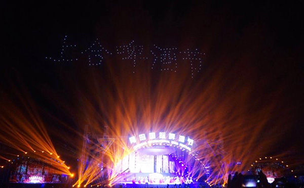 在本屆啤酒節(jié)公益形象大使黃曉明的指引下,一桶啤酒以“天外來(lái)客”方式從舞臺(tái)上方正中央的“飛碟”造型中徐徐而降。伴隨著大型歌舞《舉杯吧朋友》的演出,170架無(wú)人機(jī)凌空飛起,組成“上合啤酒節(jié)”“青島世界”字樣和“干杯”圖案,燈光焰火秀點(diǎn)亮金沙灘啤酒城。
