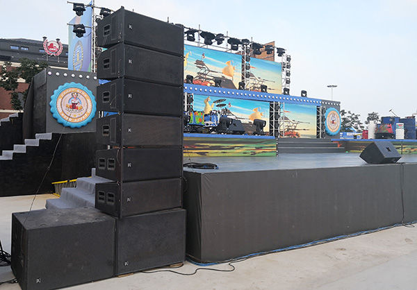 迎賓儀式巡游表演區(qū)、南區(qū)高端飲酒區(qū)舞臺(tái)、西區(qū)舞臺(tái)均采用T-LINE線陣系統(tǒng),由雙15英寸防水低頻音箱是與T-Line312H全頻防水型線陣列音箱一起成組吊掛組成的線陣列,與TLB-218配合組建就可組成指向性寬廣、投射距離遠(yuǎn)、聲壓大、聽(tīng)感良好的擴(kuò)聲系統(tǒng)。