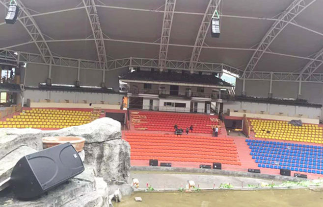 對于部分露天場景,我們優(yōu)先考慮到設(shè)備的經(jīng)久耐用,露天場所對于設(shè)備的防水,塵,腐蝕要求較高,多方面研究,決定用對當前項目性價比更高的S系列高聲壓塑膠音響,S1200N 22只,這款音響不僅保證了景區(qū)環(huán)境音樂的聲壓標準,還有極好的音質(zhì)。解決了游客游覽景區(qū)由于設(shè)備不好造成的背景音樂的噪聲,功放方面我們選擇了市場上先進的數(shù)字功放,Q3i 19臺、Q5i 2臺,其內(nèi)置強大的DSP功能,能很好的處理現(xiàn)場傳輸?shù)穆曇?,讓系統(tǒng)穩(wěn)定,強大,聲音還原度高,這套系統(tǒng)能極好的滿足半露天劇場和部分露天景區(qū)的擴聲效果。