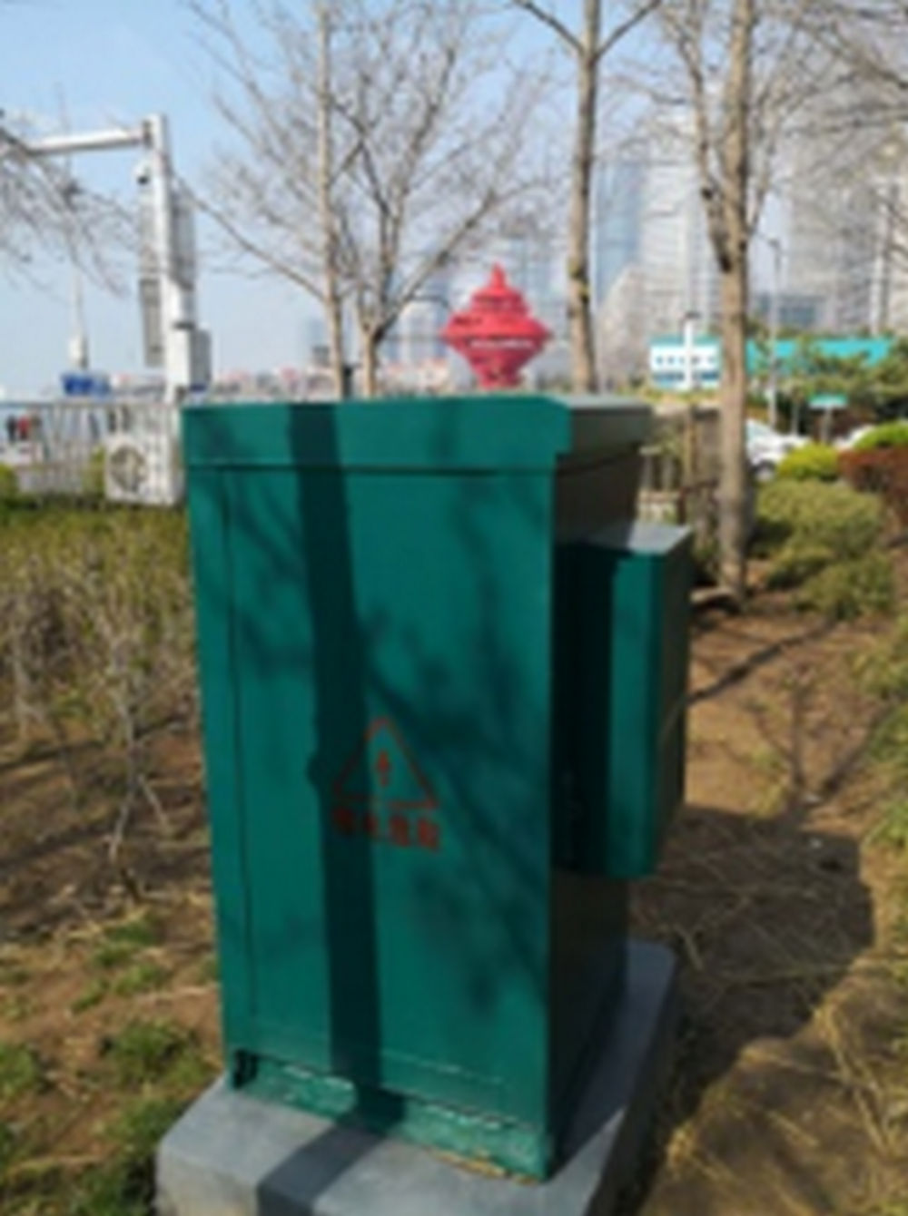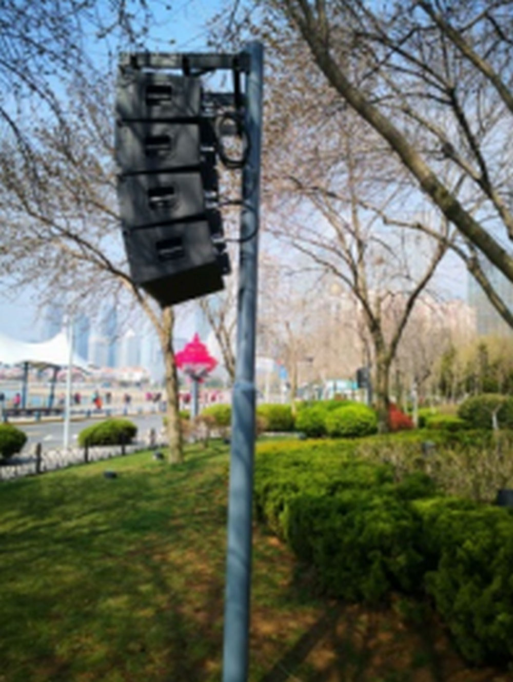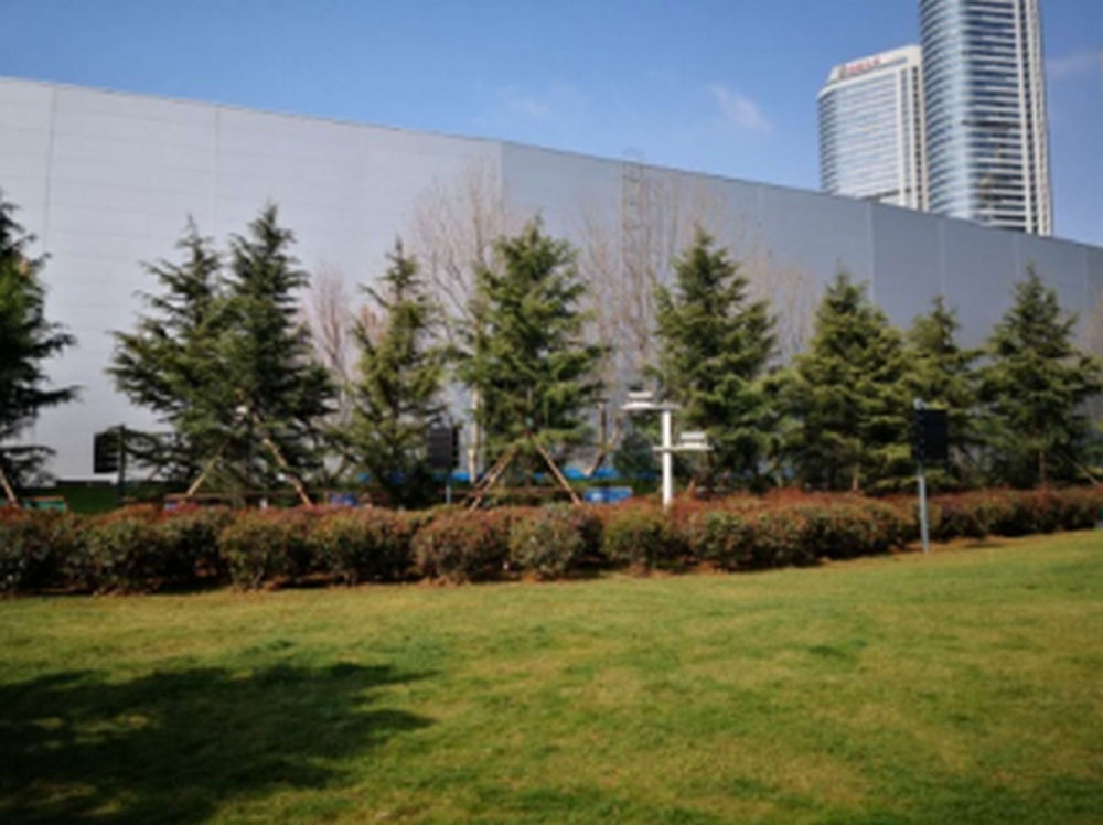 五四廣場(chǎng)分南北兩部分,分布于中軸線上的市人民政府辦公大樓、隱式噴泉、點(diǎn)陣噴泉、《五月的風(fēng)》雕塑、海上百米噴泉等。