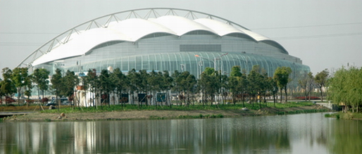 昆山市體育中心位于昆山市西部生態(tài)居住區(qū),與占地3300多畝的森林公園相映成輝,北臨馬鞍山路,南靠前進西路,東依339省道,西連昆山大學城,總占地面積近千畝。體育中心的設計定位是能承擔國際國內單項比賽和國內綜合性運動會,并兼具娛樂、會展、商貿的多功能體育公園。體育中心內建有一座擁有5400個座位、內主賽場為40M×70M、高38米的符合國際化標準的多功能體育館,一座擁有30000個座位、內場設8×400米符合國際標準的田徑跑道和一個68×108米標準草坪足球場、建筑高度達43米的體育場,另配套高標準網球場和游泳館及其他服務設施。