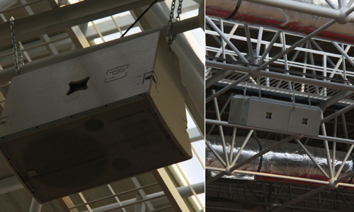 在該館中,我們可看到館頂中心區(qū)域由8只白色的∑S215作為主擴,垂直固定于棚頂,以多個扇面均勻的覆蓋中心比賽區(qū),而在兩側(cè)看臺區(qū)的頂部,則等距均勻的安裝了8只白色的RH2劇院之聲音箱,該音箱的特點是低頻腔體和全頻腔體進行分體設計,低頻下限達35Hz,聲音清淅、通透、干凈、飽滿非常適用于劇院、音樂廳及高質(zhì)量聲音還原的場所。把RH2安裝在看臺區(qū),也正是為為滿足觀眾區(qū)高質(zhì)量還音,兼顧演出的需求。細心的你還會注意到,安裝在體育館頂棚的音箱三基企業(yè)為該項目定制的白色外觀,與頂棚的顏色一致從而與建筑環(huán)境相融。