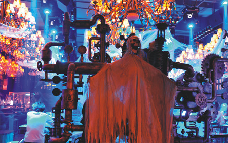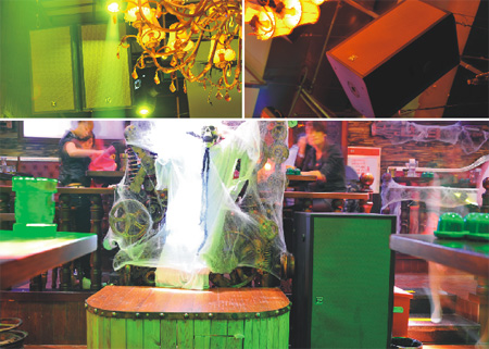 漫步入場,吧臺(tái)頂壁上依舊挑著兩顆骷髏假面,搖頭燈射出的一束束幽冷的紫藍(lán)光不時(shí)的掃向正中的僵尸殘骸,黏在吊燈上的破紗布、雜亂無章的巨型蜘蛛網(wǎng)、陰森在角落里的巫婆鬼臉,仿佛依舊沉浸在24小時(shí)前的狂歡和勁舞的氤氳里。