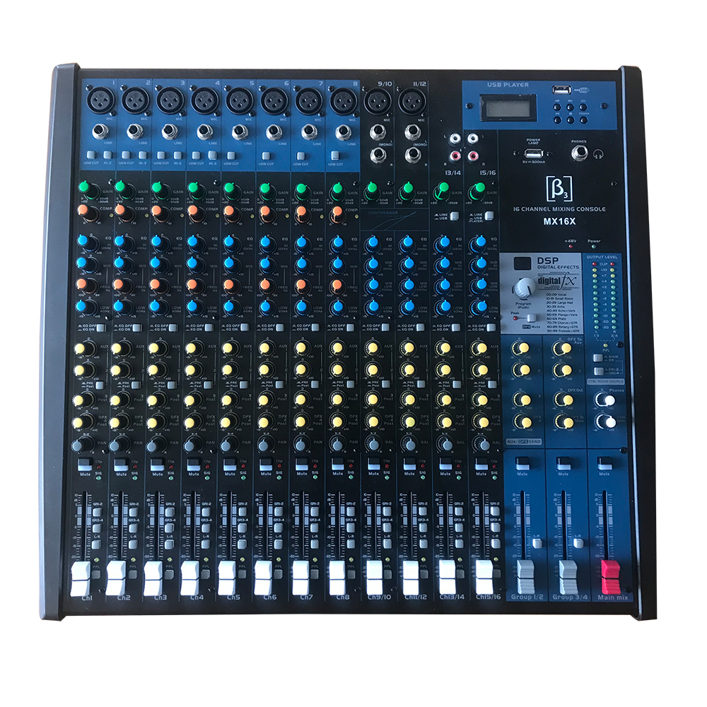 16路模擬調(diào)音臺(tái),10路平衡鍍金/6.3mm平衡MIC輸入,4個(gè)平衡式蓮花口立體聲輸入通道;