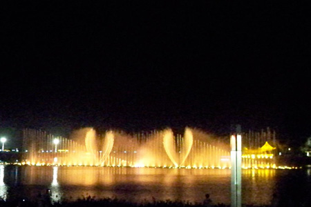 鴛鴦湖噴泉設(shè)有“一柱擎天”、“三層花噴泉”“鯤鵬展翅”十余種基本水型,配上音樂(lè)變化以及專(zhuān)業(yè)音響設(shè)備,形成超過(guò)1000種不同效果的音樂(lè)水型組合,真可謂千變?nèi)f化。