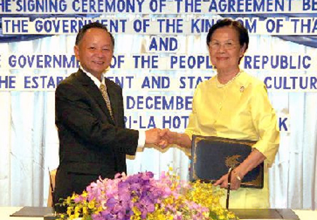為傳承泰中兩國(guó)友好往來(lái),促進(jìn)泰中兩國(guó)文化交流,2007年12月17日晚,中泰兩國(guó)正式在曼谷正式簽定了《中泰兩國(guó)關(guān)于互設(shè)非營(yíng)利性質(zhì)的文化中心及其地位的協(xié)議》,2011年11月11日,時(shí)任全國(guó)人大委員長(zhǎng)吳邦國(guó)和泰國(guó)國(guó)會(huì)主席猜•奇初及兩國(guó)文化部官員、承建方代表等在泰王室公園出席奠基儀式,本項(xiàng)目正式開(kāi)工建設(shè)。