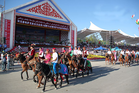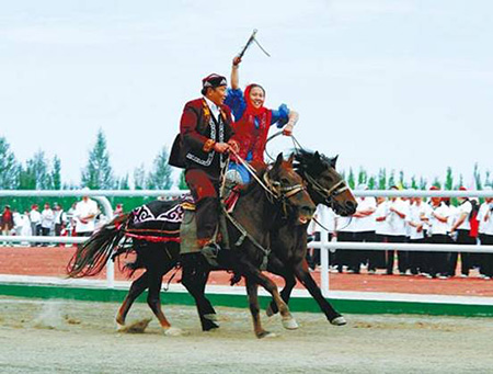 阿克塞哈薩克族自治縣地處甘、青、新三?。▍^(qū))交匯處,是甘肅省惟一一個以哈薩克族為主體的少數(shù)民族自治縣,有其獨特的地域特色和人文環(huán)境。阿克塞國際標準賽馬場及綜合體育場將濃郁的民族風情與現(xiàn)代建筑相結合,是集賽馬、健身、體育運動為一體的綜合體育運動場所,占地面積20.88萬平方米,已完成投資4000萬元,建成可容納3000人的觀禮臺、全長1公里(10跑道)的標準賽馬道、600平方米的馬術表演場,充分體現(xiàn)了高水平、生態(tài)化、人文化的建設理念,是西部首個國際標準賽馬場,熱忱為八方游客提供賽馬、賽駝、跑馬、騎馬、馬術表演等民族特色濃厚的旅游項目。作為一個設施功能完善的綜合性民族體育場所,阿克塞賽馬場為全民健身活動的順利實施奠定良好的基礎,同時成功地將賽馬等民族傳統(tǒng)體育項目納入地方文化旅游業(yè)發(fā)展體系之中,實現(xiàn)了文化搭臺,經濟唱戲,有效地促進了當?shù)亟洕⑽幕?、旅游的共同發(fā)展和各民族間的文化交流。