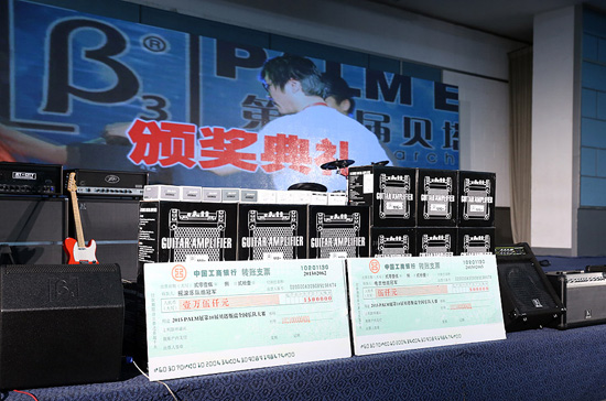 三基音響總裁劉恩海頒發(fā)Palm展第10屆貝塔斯瑞樂隊大賽電吉他組季軍獎:李寧