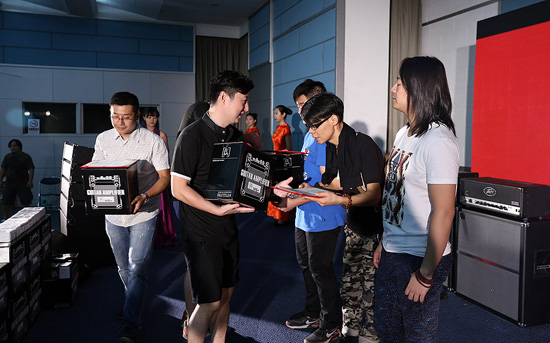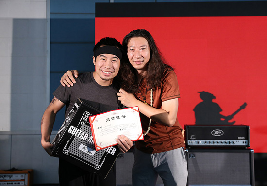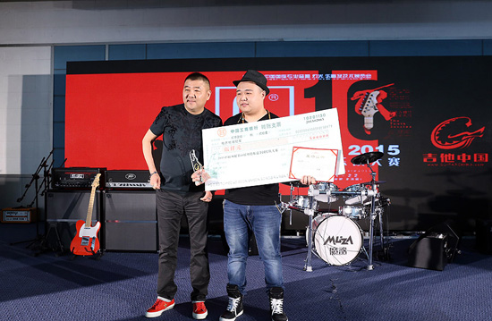 劉麟頒發(fā)Palm展第10屆貝塔斯瑞樂隊大賽電吉他組冠軍的獲獎選手:劉天宇