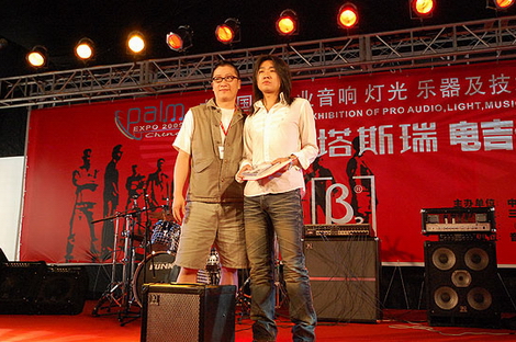 唐朝老五為獲電吉他大賽冠軍選手趙虎頒獎