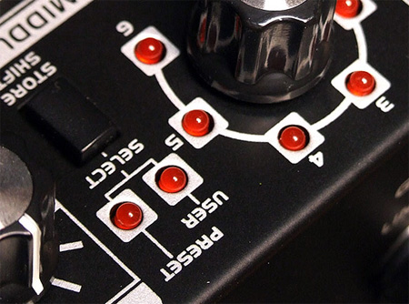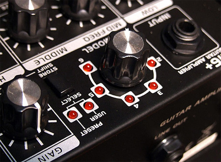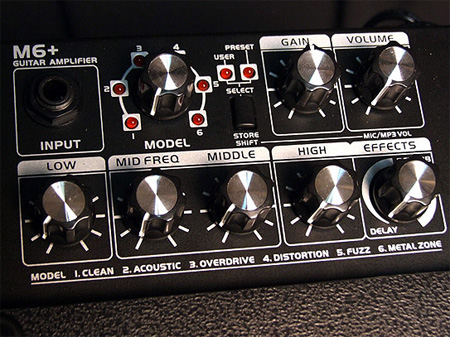 首先是面板上側(cè)更明顯的Model,6個(gè)通道供選擇,從Clean到Acoustic乃至當(dāng)下很流行的金屬音色一應(yīng)俱全。獨(dú)特的Fuzz音色,甚至是你要是想玩玩Jimi Hendrix或者Blues Saraceno也沒半點(diǎn)問題。說道這里也許還沒有但覺出什么特別之處。那么讓我們?cè)偻铱?,一個(gè)在音箱上很不常見的鈕。那就是負(fù)責(zé)存儲(chǔ)音色的編輯鈕。通過點(diǎn)擊Select旋鈕選擇User模式,選擇自己想要的通道,一番調(diào)節(jié)后,長(zhǎng)按Select就可以存儲(chǔ)剛才的音色??梢詾槊總€(gè)通道可以編輯一個(gè)音色,并能同時(shí)使用Delay/Reverb來進(jìn)行潤(rùn)色,編輯好以后,只要Model旋到相對(duì)的通道,你之前的音色就會(huì)被調(diào)出來。這個(gè)功能可謂是非常之強(qiáng)大,對(duì)于又有一堆堆合成/單塊老鳥們也許不算什么,但是,如果想簡(jiǎn)單直接的又能有一個(gè)全面的音色來練習(xí)的話。這個(gè)功能應(yīng)該說是再使用不過了。