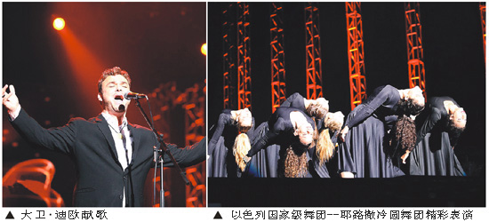 大衛(wèi)·迪歐獻唱的以色列傳統(tǒng)歌曲、歌曲《貓》的插曲《Memory》以及中國民歌《敖包相會》讓中國和以色列兩種不同文化和諧地交融。精彩的演出令人陶醉、全場掌聲連綿?;趾氲难莩隼_了以色列館昭示世人,展示交流的主題序曲。