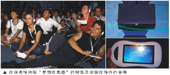 信息通信館包括迎賓大廳、前展、魔幻劇院、后展等幾大展覽展館,當你用信息通信終端把每個場館精彩畫面中的夢想收集完畢以后,所有的夢想便會自動上傳到網(wǎng)站,你可上網(wǎng)重新打開這些 “夢想”,細細回味。