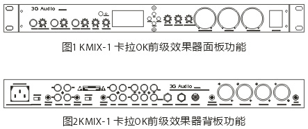 KMIX-1是一個(gè)2進(jìn)4出(左、右、中間通道,低音通道)信號(hào)處理,左、右聲道的人聲和音樂(lè)是可以分別進(jìn)行調(diào)整的,中間通道僅僅是一個(gè)沒(méi)有效果直達(dá)的人聲。見(jiàn)圖1面板功能和圖2,背板功能