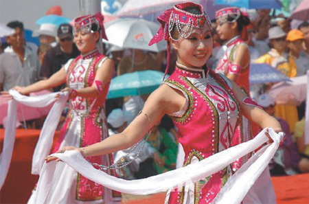每年7、8月間,內(nèi)蒙古大草原歌舞的海洋、花的海洋,人們用“那達慕”形式慶賀風調(diào)雨順的豐收年,贊頌美好的生活?!澳沁_慕”大會通常以旗、蘇木為單位,每年夏天舉行,時間為10天左右。后來慢慢逐步演變成為節(jié)慶活動,更名為“那達慕草原旅游節(jié)”,時間為每年7月15日左右開始,除了競技比賽外,還有嘛尼會、元代宮廷宴、詐馬宴、鄂爾多斯婚禮、成吉思汗陵祭奠和溫泉森林、蒙古族風俗游及開展經(jīng)貿(mào)交流等活動。而今年的那達慕大會上還舉辦了祭敖包、篝火晚會、草原狂歡及搭建蒙古包、奶食品加工等參與性活動,讓游客切身體驗到了民族風情的魅力。