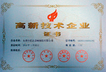 2011年1月13日,經(jīng)過(guò)為期15天的公示,廣東省被擬認(rèn)定的 2010 年第二批國(guó)家高新技術(shù)企業(yè)正式被認(rèn)定為“國(guó)家高新技術(shù)企業(yè)”。三基音響企業(yè)制造工廠—東莞市億達(dá)音響制造有限公司亦榜上有名。這是繼2006年三基被認(rèn)定為廣東省級(jí)高新技術(shù)企業(yè)之后的又一次產(chǎn)業(yè)技術(shù)升級(jí),三基音響企業(yè)涉足的技術(shù)領(lǐng)域亦正式