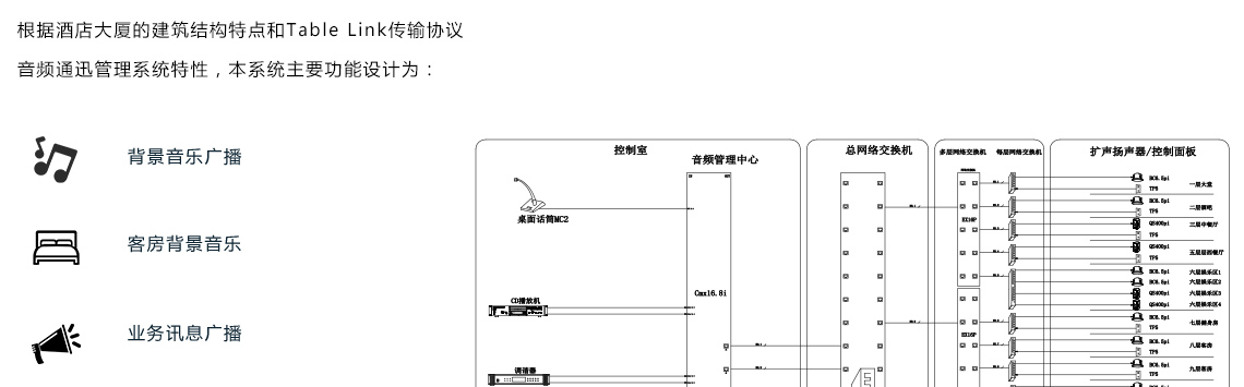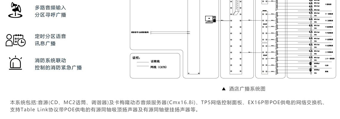 系統(tǒng)采用卡梅隆動態(tài)音頻服務(wù)器Cmx16.8i作為整個音頻系統(tǒng)的核心,負責整個音頻系統(tǒng)的信號處理、路由分區(qū)、網(wǎng)絡(luò)配置、信號管理等。Cmx16.8i使用的是Table Link協(xié)議,基于PC實時處理的原理,可以很好的處理音效、動態(tài)、混音、均衡等,同時具備自適應(yīng)混音消除、回聲消除、噪聲消除、音頻分配系統(tǒng)的模擬源輸入以及GPIO控制等。功能更加強大、性能更加完善、操作更加方便、向集成化、模塊化、智慧化的方向發(fā)展,所有級聯(lián)備只需一條六類網(wǎng)線進行連接。同時,每層單獨設(shè)置有控制面板,方便獨立進行一些控制和廣播。從而達到集中聯(lián)控、分區(qū)廣播、就近應(yīng)急快速廣播等多種功能需求。實現(xiàn)不同的公共廣播功能,以優(yōu)越的聲音,極低的噪音電平及杰出的性價比演繹先進廣播科技。